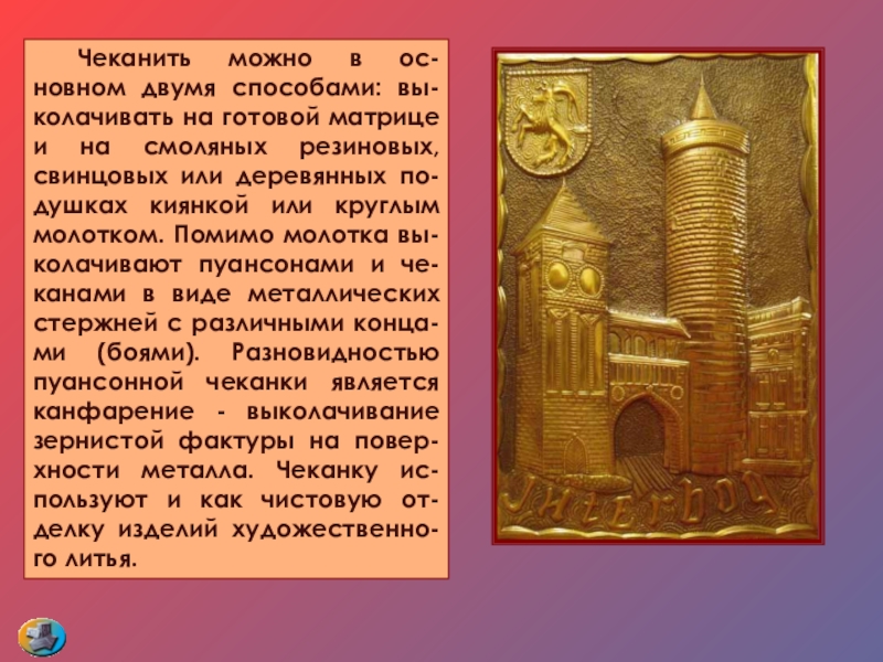 на смоляных резиновых, свинцовых или деревянных по-душках киянкой или круглым молотком. Помимо молотка вы-колачивают пуансонами и че-канами в виде металлических стержней с различными конца-ми (боями). Разновидностью пуансонной чеканки является канфарение - выколачивание зернистой фактуры на повер-хности металла. Чеканку ис-пользуют и как чистовую от-делку изделий художественно-го литья.