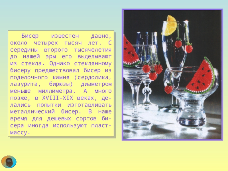 Слайд 56 Бисер известен давно, около четырех тысяч лет. С середины второго тысячелетия