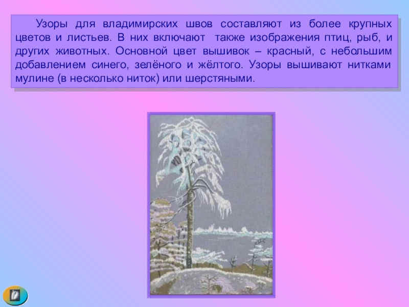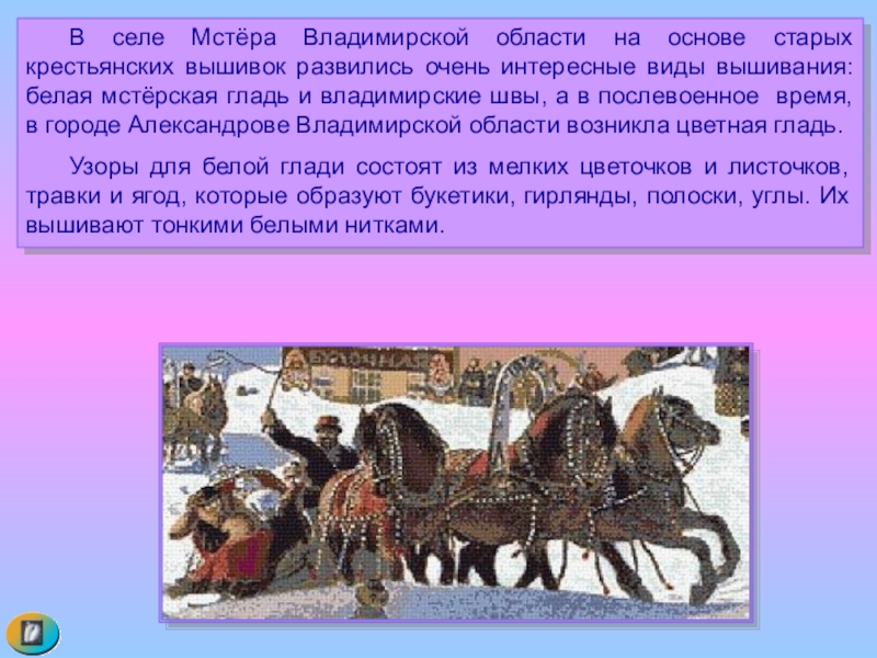 Слайд 8 В селе Мстёра Владимирской области на основе старых крестьянских вышивок развились