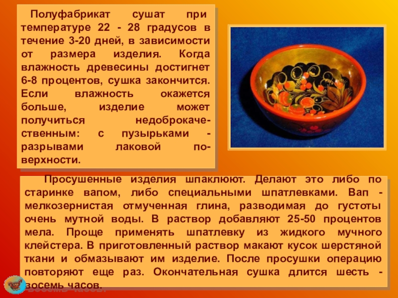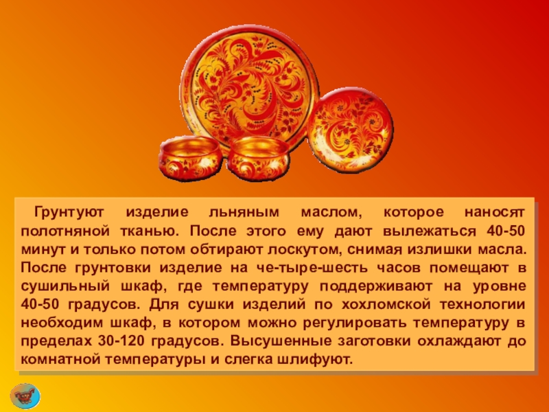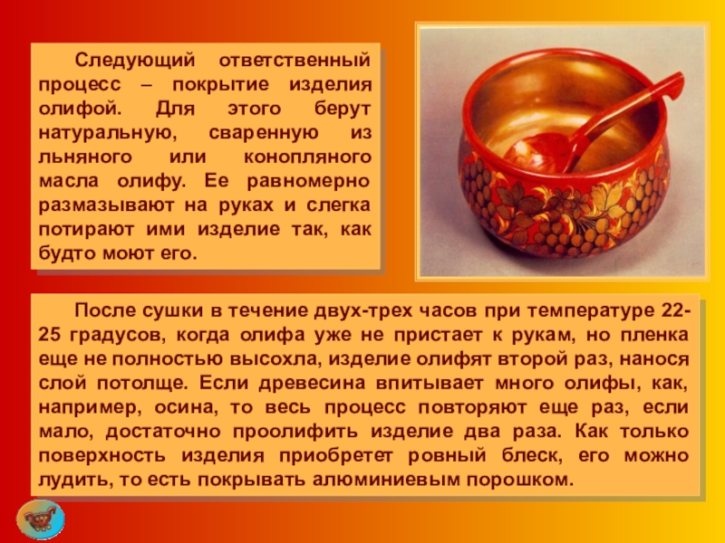 Слайд 50 Следующий ответственный процесс – покрытие изделия олифой. Для этого берут натуральную,