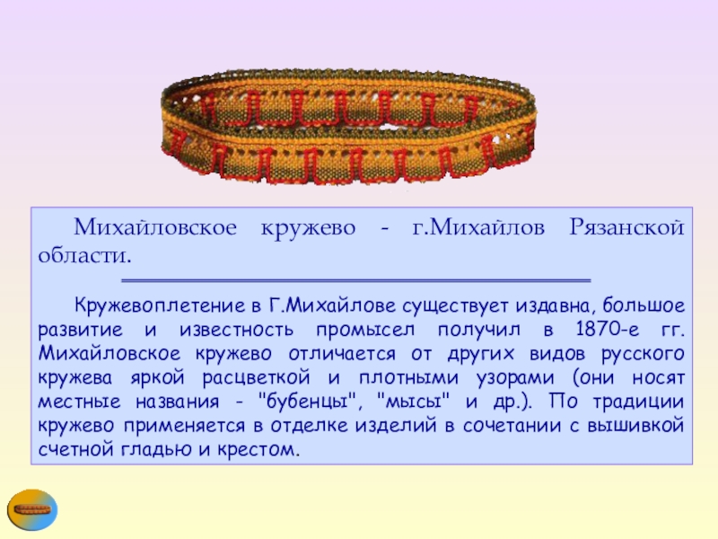 большое развитие и известность промысел получил в 1870-е гг. Михайловское кружево отличается от других видов русского кружева яркой расцветкой и плотными узорами (они носят местные названия - "бубенцы", "мысы" и др.). По традиции кружево применяется в отделке изделий в сочетании с вышивкой счетной гладью и крестом.