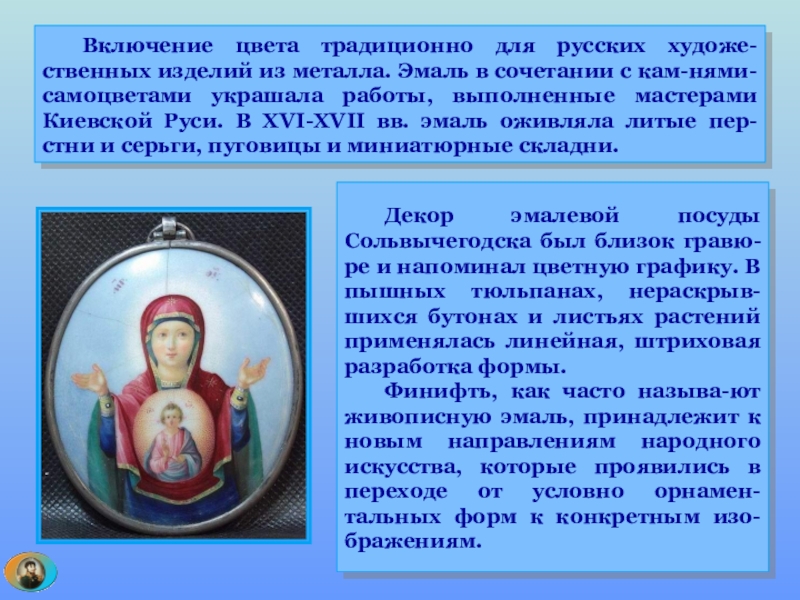 Финифть, как часто называ-ют живописную эмаль, принадлежит к новым направлениям народного искусства, которые проявились в переходе от условно орнамен-тальных форм к конкретным изо-бражениям.