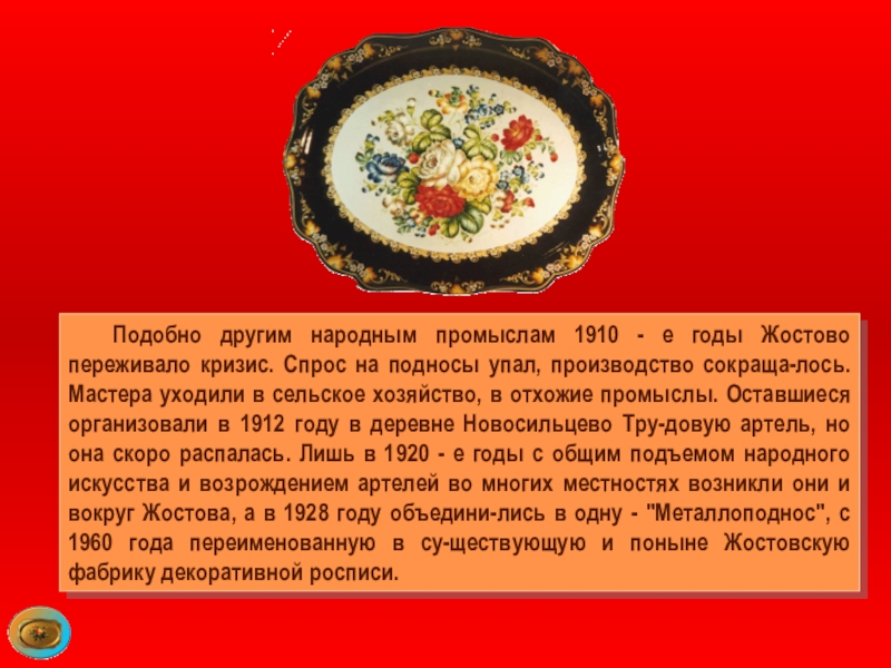 Слайд 67 Подобно другим народным промыслам 1910 - е годы Жостово переживало кризис.