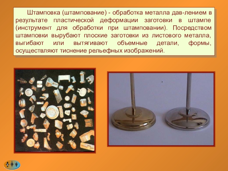Слайд 97 Штамповка (штампование) - обработка металла дав-лением в результате пластической деформации заготовки