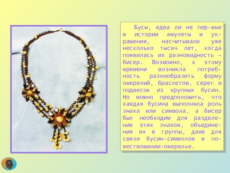 уже несколько тысяч лет, когда появилась их разновидность – бисер. Возможно, к этому времени возникла потреб-ность разнообразить форму ожерелий, браслетов, серег и подвесок из крупных бусин. Но можно предположить, что каждая бусина выполняла роль знака или символа, а бисер был необходим для разделе-ния этих знаков, объедине-ния их в группы, даже для связи бусин-символов в по-вествовании-ожерелье.