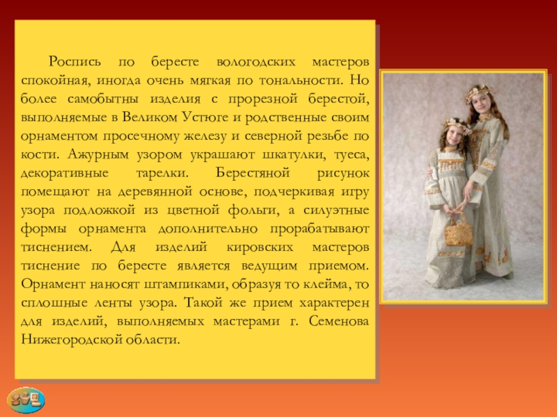Слайд 33 Роспись по бересте вологодских мастеров спокойная, иногда очень мягкая по тональности.