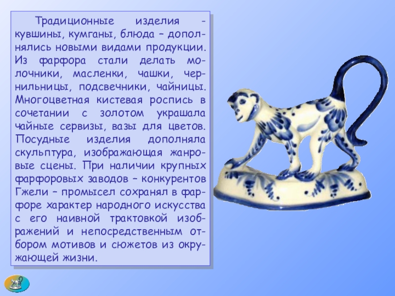 Из фарфора стали делать мо-лочники, масленки, чашки, чер-нильницы, подсвечники, чайницы. Многоцветная кистевая роспись в сочетании с золотом украшала чайные сервизы, вазы для цветов. Посудные изделия дополняла скульптура, изображающая жанро-вые сцены. При наличии крупных фарфоровых заводов – конкурентов Гжели – промысел сохранял в фар-форе характер народного искусства с его наивной трактовкой изоб-ражений и непосредственным от-бором мотивов и сюжетов из окру-жающей жизни.