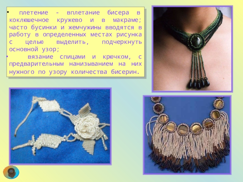 Слайд 63 плетение - вплетание бисера в коклюшечное кружево и в макраме;