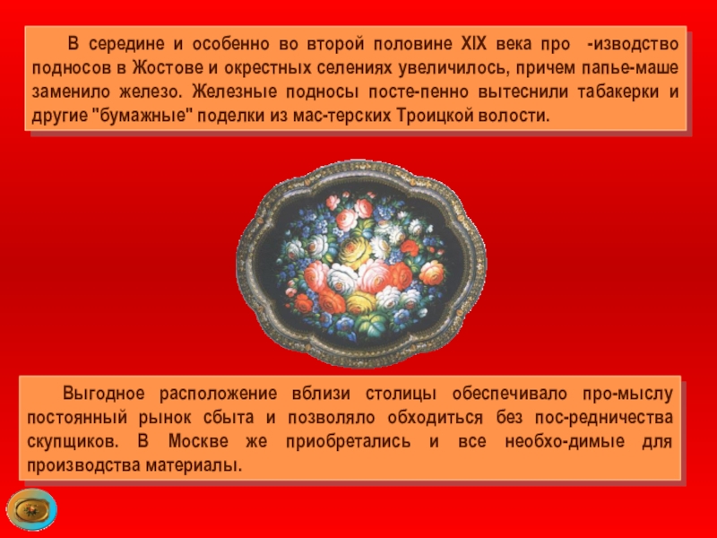 подносов в Жостове и окрестных селениях увеличилось, причем папье-маше заменило железо. Железные подносы посте-пенно вытеснили табакерки и другие "бумажные" поделки из мас-терских Троицкой волости.