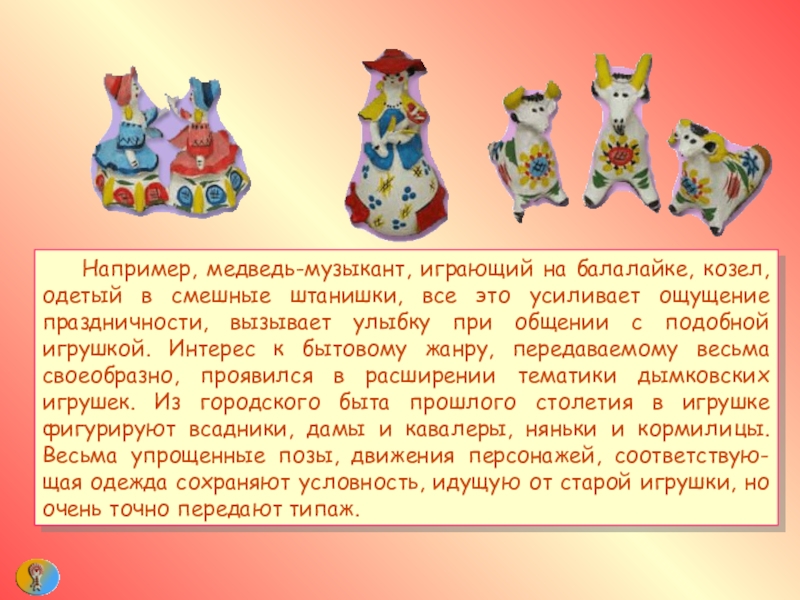 Слайд 13 Например, медведь-музыкант, играющий на балалайке, козел, одетый в смешные штанишки, все