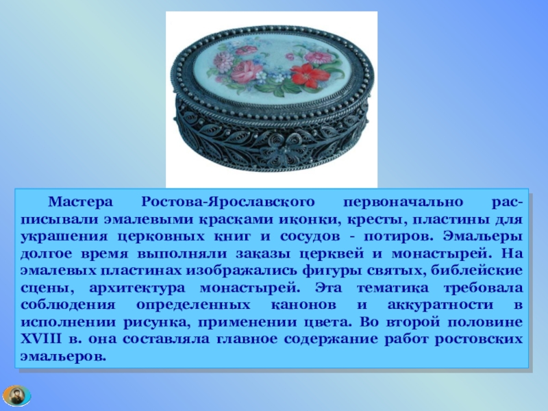 церковных книг и сосудов - потиров. Эмальеры долгое время выполняли заказы церквей и монастырей. На эмалевых пластинах изображались фигуры святых, библейские сцены, архитектура монастырей. Эта тематика требовала соблюдения определенных канонов и аккуратности в исполнении рисунка, применении цвета. Во второй половине XVIII в. она составляла главное содержание работ ростовских эмальеров.
