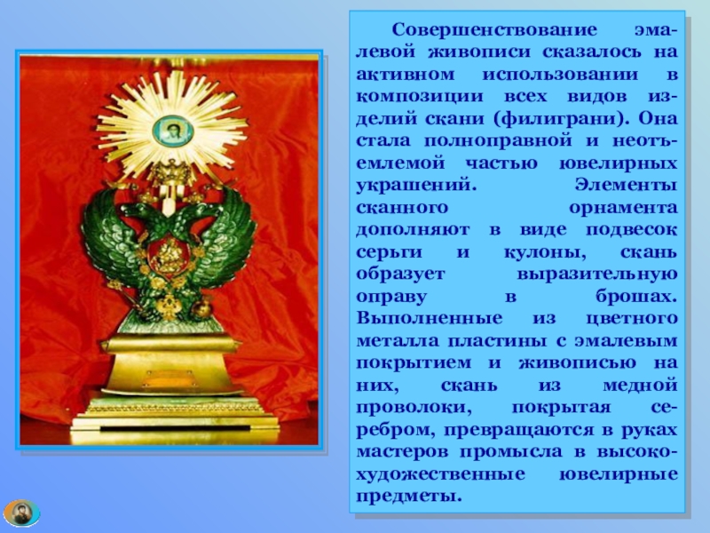 Слайд 79 Включение цвета традиционно для русских художе-ственных изделий из металла. Эмаль в