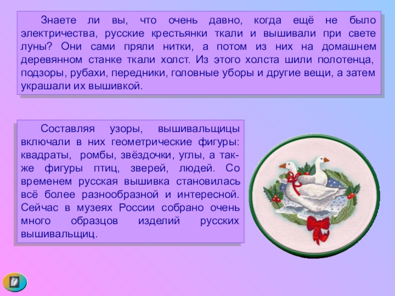 русские крестьянки ткали и вышивали при свете луны? Они сами пряли нитки, а потом из них на домашнем деревянном станке ткали холст. Из этого холста шили полотенца, подзоры, рубахи, передники, головные уборы и другие вещи, а затем украшали их вышивкой.