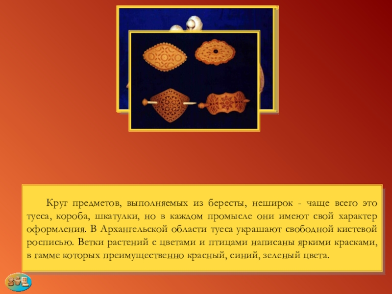 короба, шкатулки, но в каждом промысле они имеют свой характер оформления. В Архангельской области туеса украшают свободной кистевой росписью. Ветки растений с цветами и птицами написаны яркими красками, в гамме которых преимущественно красный, синий, зеленый цвета.