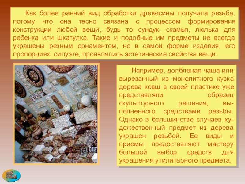 Слайд 74 Как более ранний вид обработки древесины получила резьба, потому что она