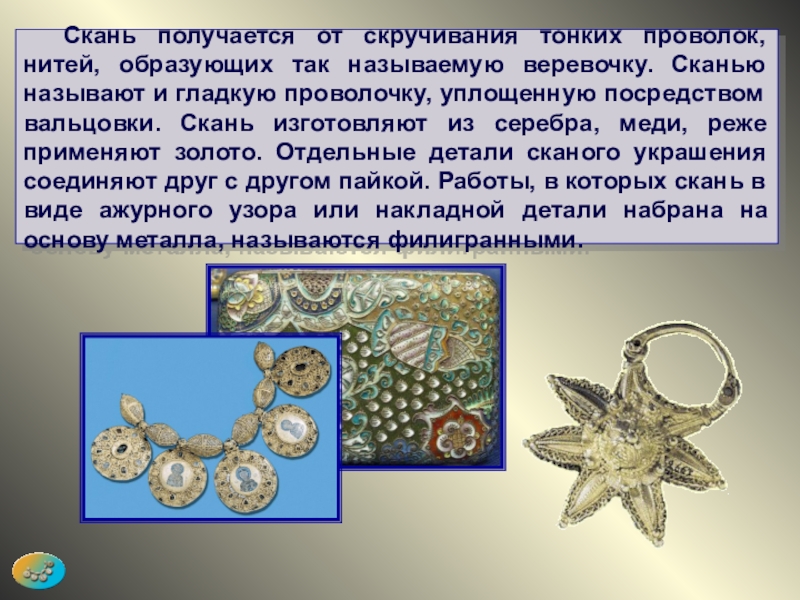 Сканью называют и гладкую проволочку, уплощенную посредством вальцовки. Скань изготовляют из серебра, меди, реже применяют золото. Отдельные детали сканого украшения соединяют друг с другом пайкой. Работы, в которых скань в виде ажурного узора или накладной детали набрана на основу металла, называются филигранными.