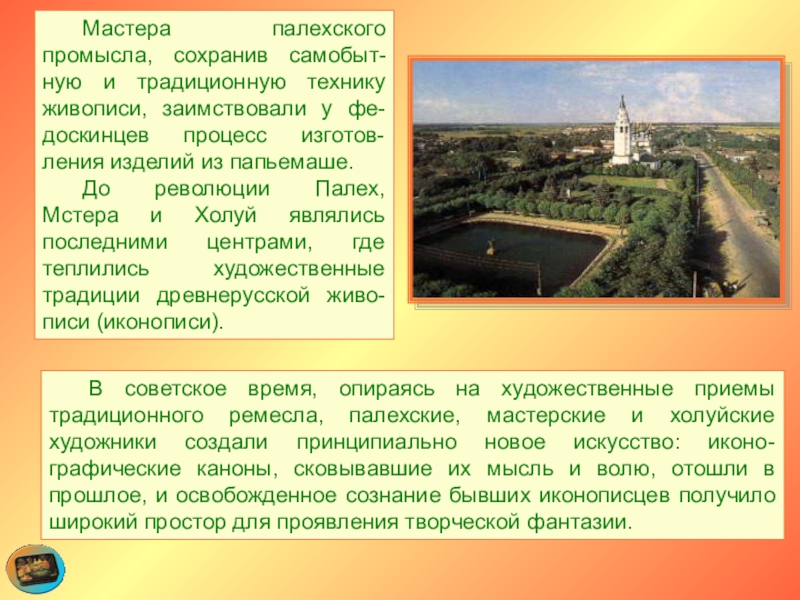 До революции Палех, Мстера и Холуй являлись последними центрами, где теплились художественные традиции древнерусской живо-писи (иконописи).