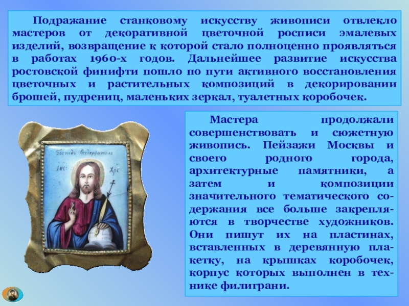 изделий, возвращение к которой стало полноценно проявляться в работах 1960-х годов. Дальнейшее развитие искусства ростовской финифти пошло по пути активного восстановления цветочных и растительных композиций в декорировании брошей, пудрениц, маленьких зеркал, туалетных коробочек.