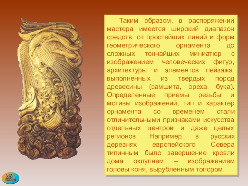 линий и форм геометрического орнамента до сложных тончайших миниатюр с изображением человеческих фигур, архитектуры и элементов пейзажа, выполненных из твердых пород древесины (самшита, ореха, бука). Определенные приемы резьбы и мотивы изображений, тип и характер орнамента со временем стали отличительными признаками искусства отдельных центров и даже целых регионов. Например, в русских деревнях европейского Севера типичным было завершение кровли дома охлупнем – изображением головы коня, вырубленным топором.