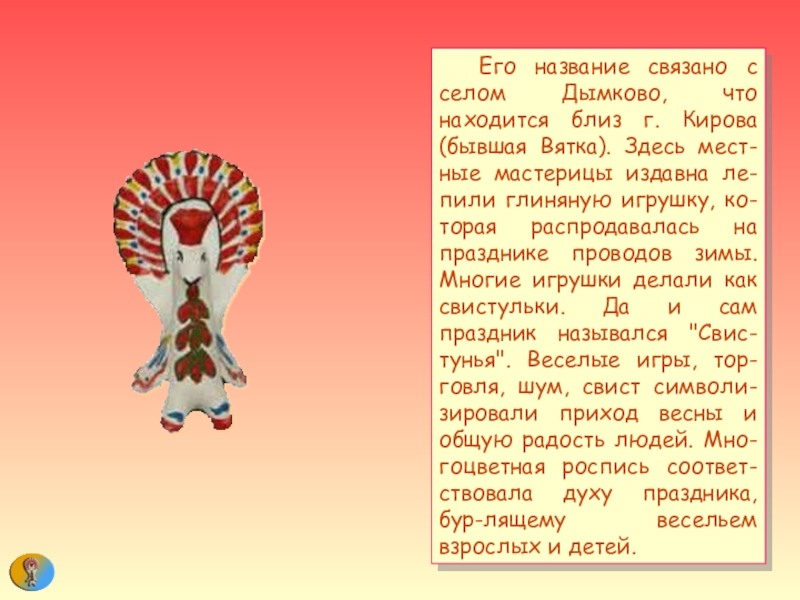 (бывшая Вятка). Здесь мест-ные мастерицы издавна ле-пили глиняную игрушку, ко-торая распродавалась на празднике проводов зимы. Многие игрушки делали как свистульки. Да и сам праздник назывался "Свис-тунья". Веселые игры, тор-говля, шум, свист символи-зировали приход весны и общую радость людей. Мно-гоцветная роспись соответ-ствовала духу праздника, бур-лящему весельем взрослых и детей.