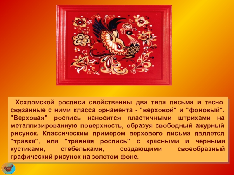 класса орнамента - "верховой" и "фоновый". "Верховая" роспись наносится пластичными штрихами на металлизированную поверхность, образуя свободный ажурный рисунок. Классическим примером верхового письма является "травка", или "травная роспись" с красными и черными кустиками, стебельками, создающими своеобразный графический рисунок на золотом фоне.