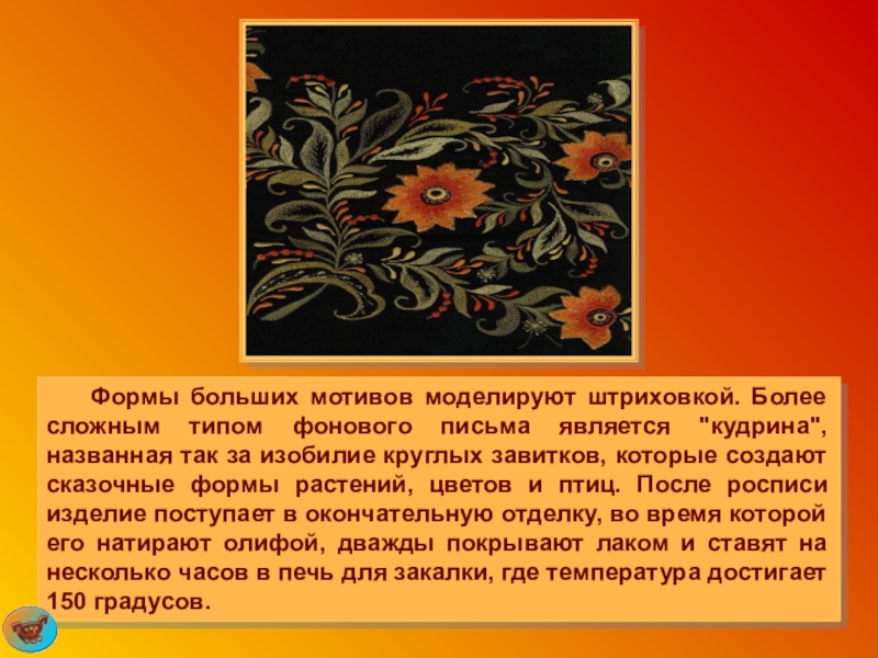 "кудрина", названная так за изобилие круглых завитков, которые создают сказочные формы растений, цветов и птиц. После росписи изделие поступает в окончательную отделку, во время которой его натирают олифой, дважды покрывают лаком и ставят на несколько часов в печь для закалки, где температура достигает 150 градусов.