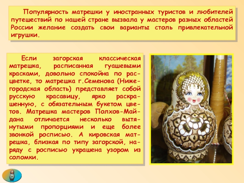 Если загорская классическая матрешка, расписанная гуашевыми красками, довольно спокойна по рас-цветке, то матрешка г.Семенова (Ниже-городская область) представляет собой русскую красавицу, ярко раскра-шенную, с обязательным букетом цве-тов. Матрешка мастеров Полхов-Май-дана отличается несколько вытя-нутыми пропорциями и еще более звонкой росписью. А кировская мат-решка, близкая по типу загорской, на-ряду с росписью украшена узором из соломки.