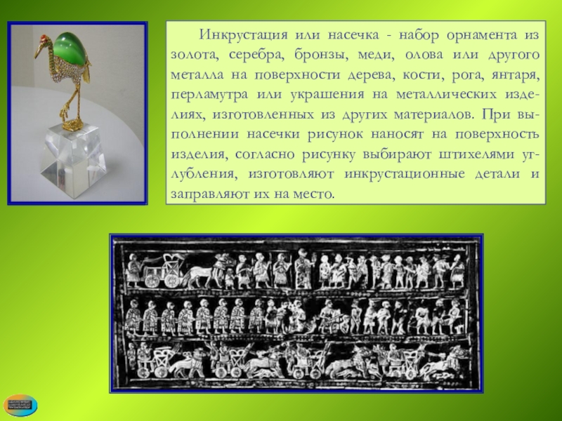 Слайд 88 Инкрустация или насечка - набор орнамента из золота, серебра, бронзы, меди,