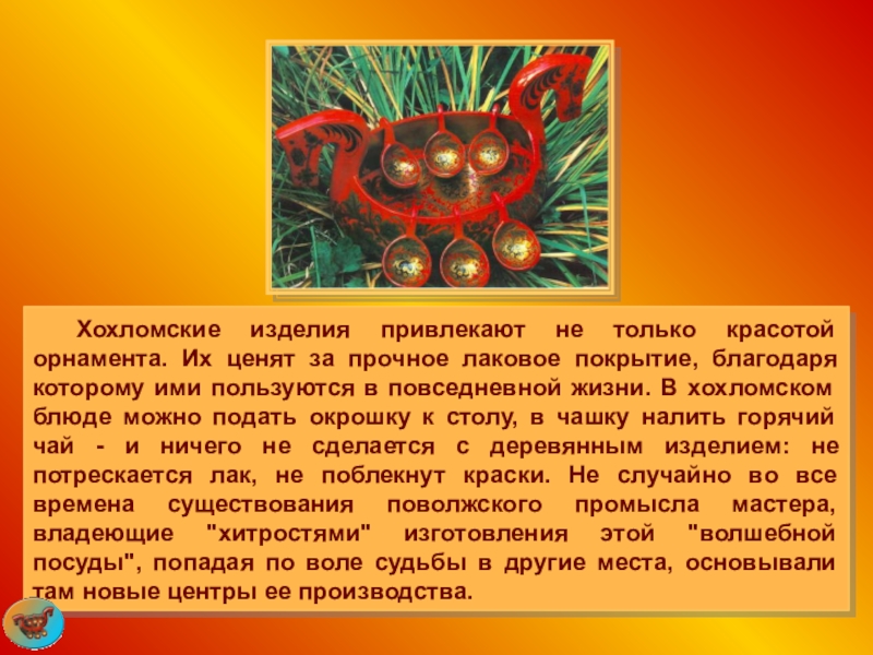 Слайд 45 Хохломские изделия привлекают не только красотой орнамента. Их ценят за прочное