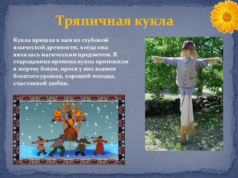 Кукла без лица считалась предметом неодушевленным, недоступным для вселения недобрых сил, злых, а значит, и безвредных для ребёнка. Она должна была принести здоровье, радость, благополучие. Это было чудо: из нескольких тряпочек, без рук, без ног, без лица передавался характер куклы. Кукла была многолика, она могла смеяться и плакать.