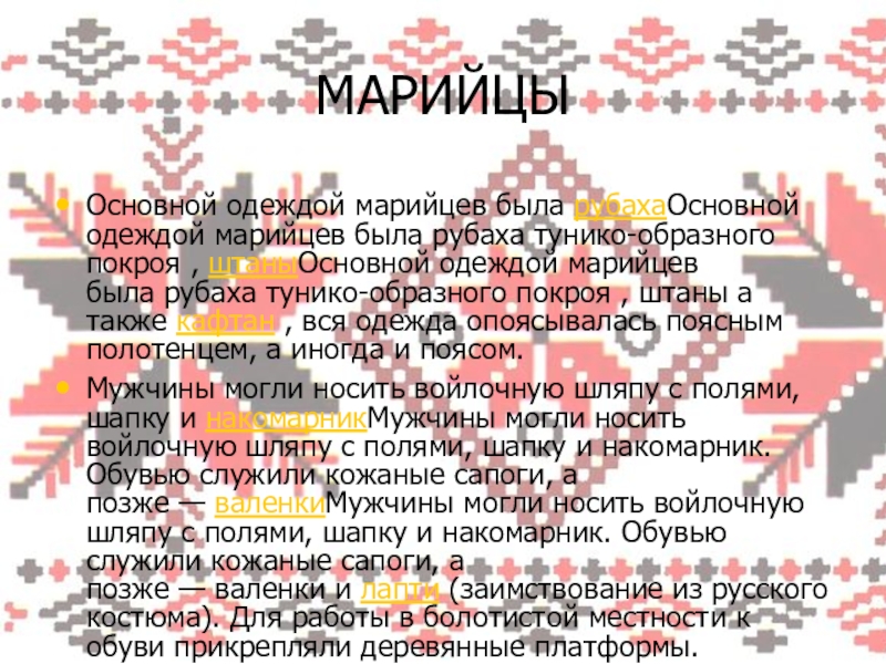 Основной одеждой марийцев была рубахаОсновной одеждой марийцев была рубаха тунико-образного покроя , штаныОсновной одеждой марийцев