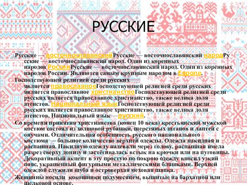 Ру́сские — восточнославянскийРу́сские — восточнославянский народРу́сские — восточнославянский народ. Один из коренных народов РоссииРу́сские — восточнославянский народ. Один из коренных народов России. Являются самым