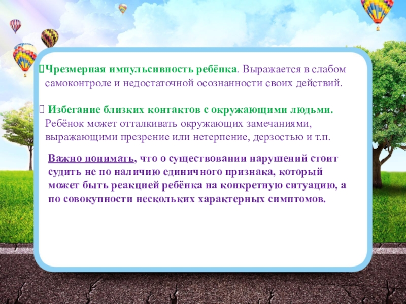 Слайд 8Чрезмерная импульсивность ребёнка. Выражается в слабом самоконтроле и недостаточной осознанности своих