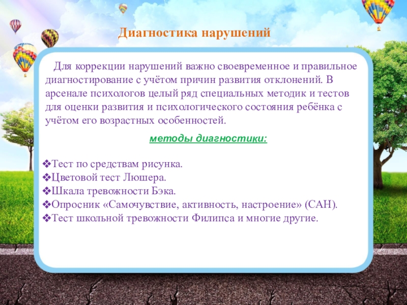 с учётом причин развития отклонений. В арсенале психологов целый ряд специальных методик и тестов для оценки развития и психологического состояния ребёнка с учётом его возрастных особенностей.