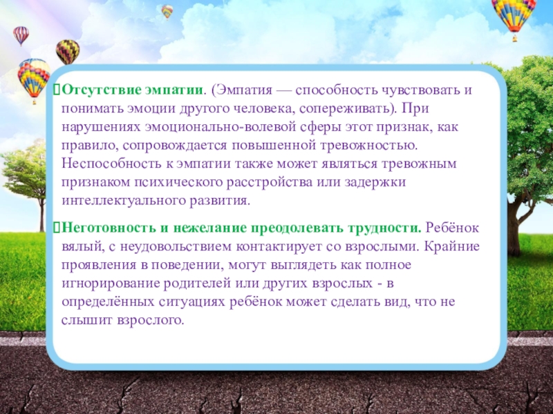 Слайд 6Отсутствие эмпатии. (Эмпатия — способность чувствовать и понимать эмоции другого человека,