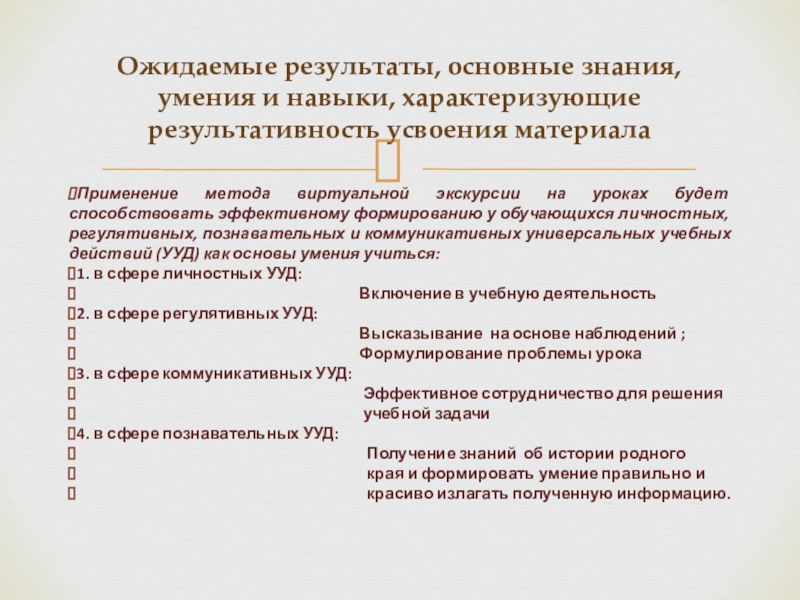 Ожидаемые результаты, основные знания, умения и навыки, характеризующие результативность усвоения материала