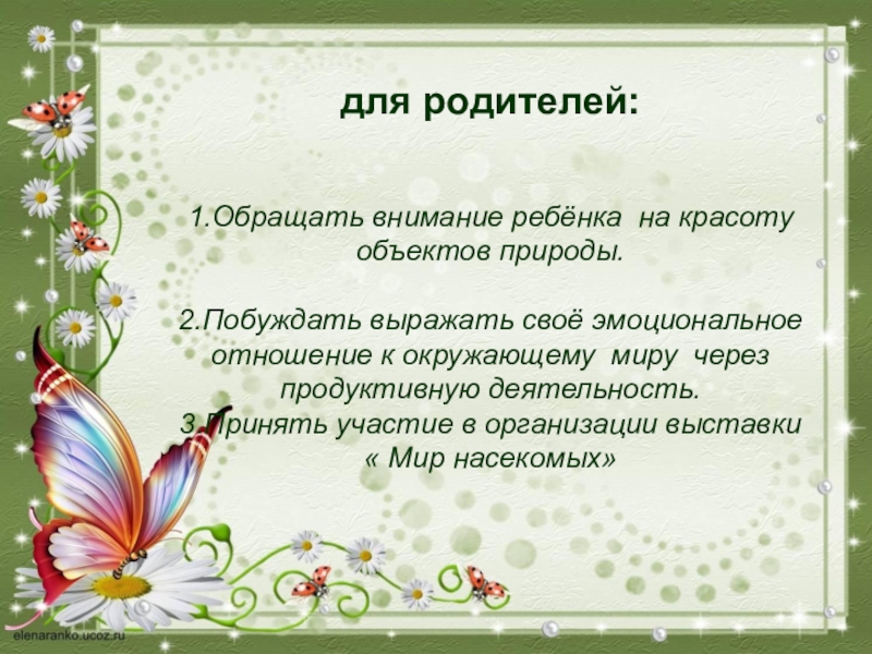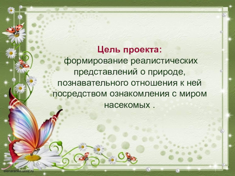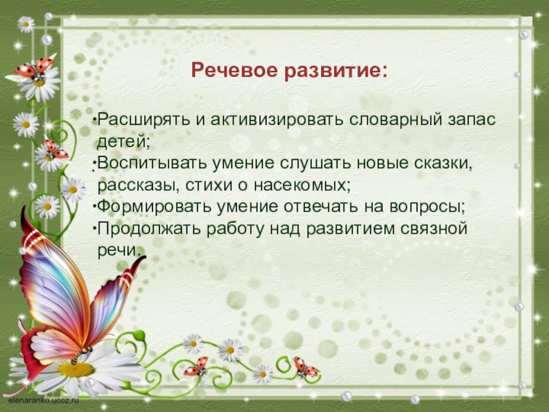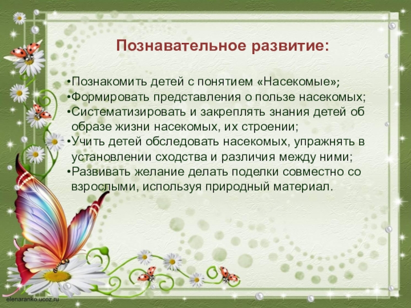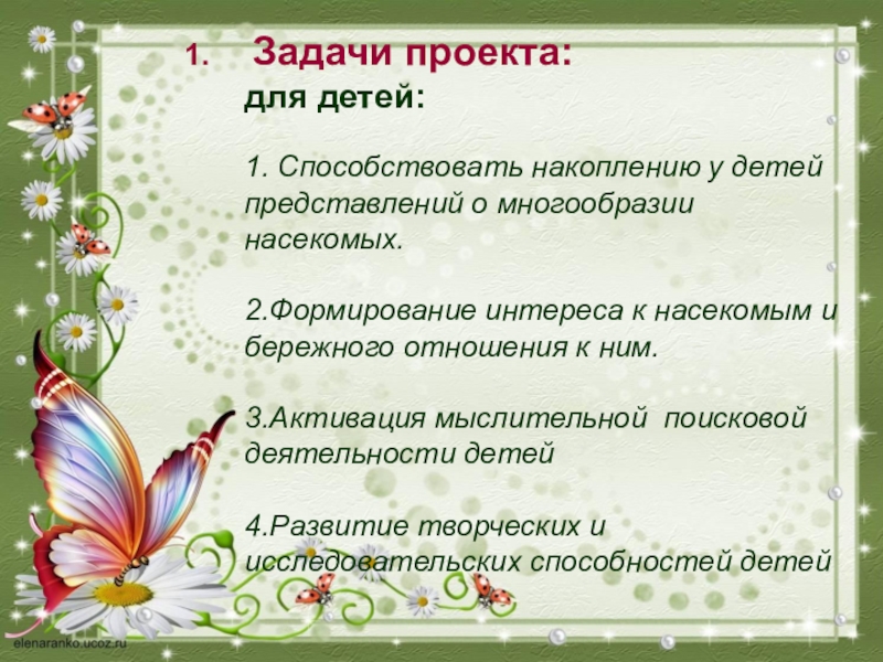 1. Способствовать накоплению у детей представлений о многообразии насекомых.