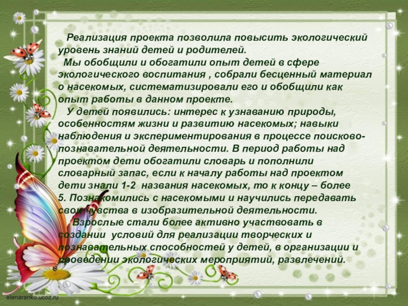 Мы обобщили и обогатили опыт детей в сфере экологического воспитания , собрали бесценный материал о насекомых, систематизировали его и обобщили как опыт работы в данном проекте.