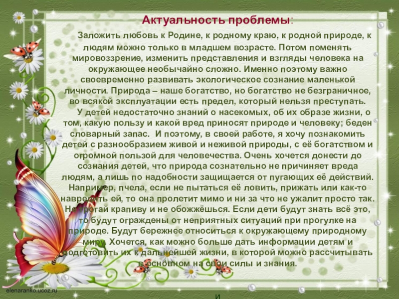 У детей недостаточно знаний о насекомых, об их образе жизни, о том, какую пользу и какой вред приносят природе и человеку; беден словарный запас. И поэтому, в своей работе, я хочу познакомить детей с разнообразием живой и неживой природы, с её богатством и огромной пользой для человечества. Очень хочется донести до сознания детей, что природа сознательно не причиняет вреда людям, а лишь по надобности защищается от пугающих её действий. Например, пчела, если не пытаться её ловить, прижать или как-то навредить ей, то она пролетит мимо и ни за что не ужалит просто так. Не трогай крапиву и не обожжёшься. Если дети будут знать всё это, то будут ограждены от неприятных ситуаций при прогулке на природе. Будут бережнее относиться к окружающему природному миру. Хочется, как можно больше дать информации детям и подготовить их к дальнейшей жизни, в которой можно рассчитывать в основном на свои силы и знания.