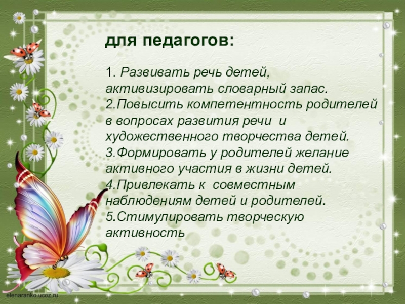 1. Развивать речь детей, активизировать словарный запас. 2.Повысить компетентность родителей в вопросах развития речи и художественного творчества детей. 3.Формировать у родителей желание активного участия в жизни детей. 4.Привлекать к совместным наблюдениям детей и родителей. 5.Стимулировать творческую активность