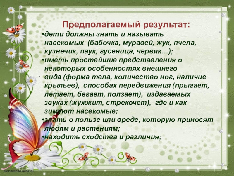 - для детей: - сформированная база знаний у детей о мире насекомых - формирование интереса к насекомым и бережное отношение к ним - развитие умения рассуждать, наблюдать - развитие речи у детей, активного словаря - формирование у детей интереса к экспериментальной деятельности. - для педагогов: - развитие у детей коммуникативных навыков, умений работать в команде