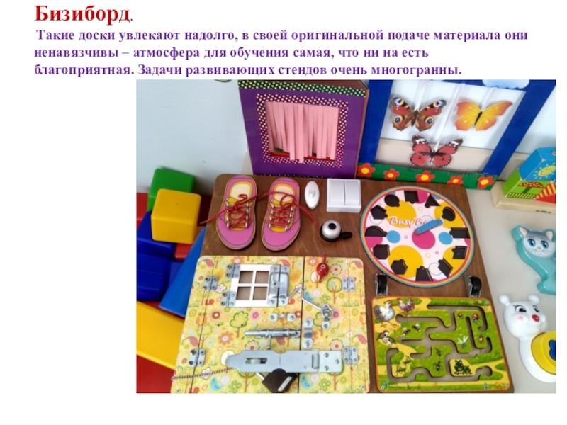 Слайд 8Бизиборд. Такие доски увлекают надолго, в своей оригинальной подаче материала они