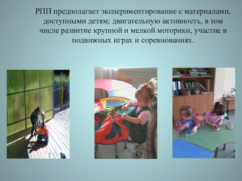 РПП предполагает экспериментирование с материалами, доступными детям; двигательную активность, в том