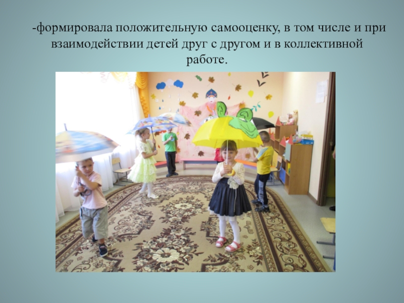 Слайд 5-формировала положительную самооценку, в том числе и при взаимодействии детей друг