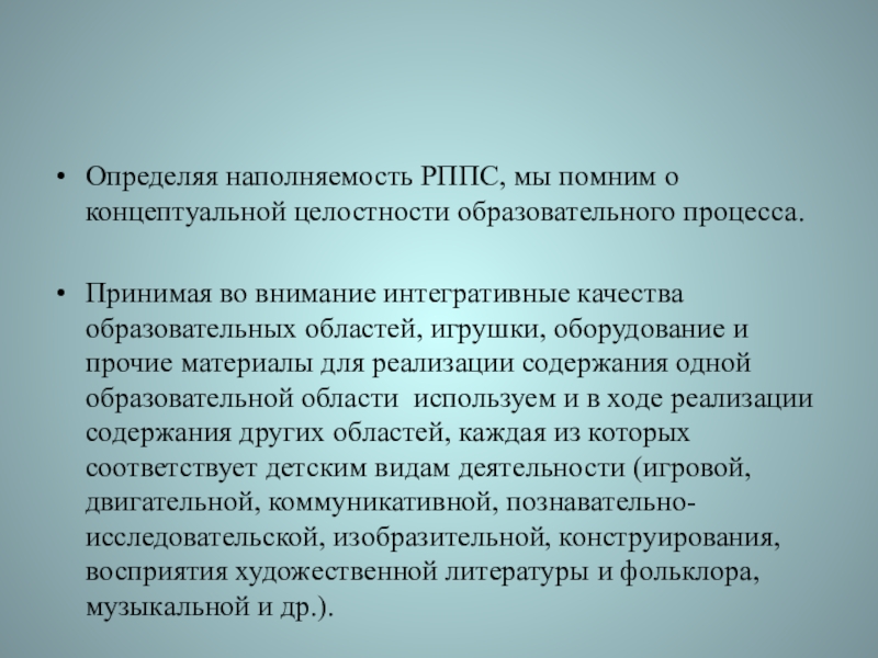 Слайд 19Определяя наполняемость РППС, мы помним о концептуальной целостности образовательного процесса.