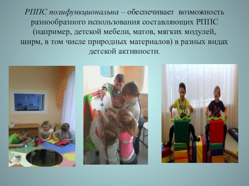 РППС полифункциональна – обеспечивает возможность разнообразного использования составляющих РППС (например, детской