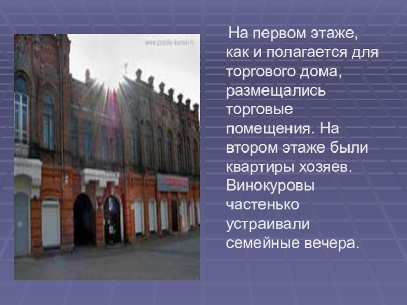 размещались торговые помещения. На втором этаже были квартиры хозяев. Винокуровы частенько устраивали семейные вечера.