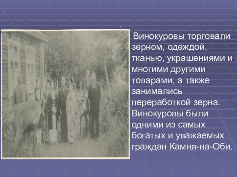 другими товарами, а также занимались переработкой зерна. Винокуровы были одними из самых богатых и уважаемых граждан Камня-на-Оби.