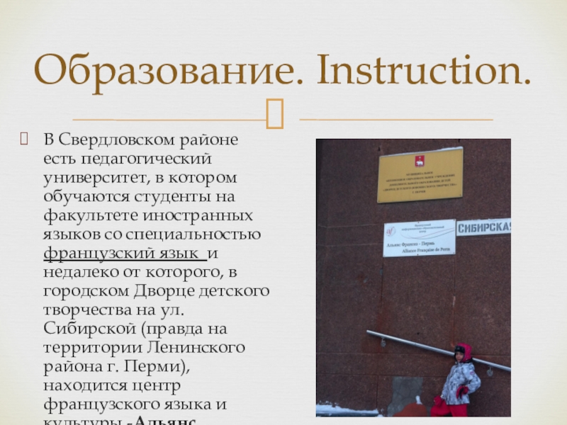 на факультете иностранных языков со специальностью французский язык и недалеко от которого, в городском Дворце детского творчества на ул. Сибирской (правда на территории Ленинского района г. Перми),находится центр французского языка и культуры -Альянс Франсез.