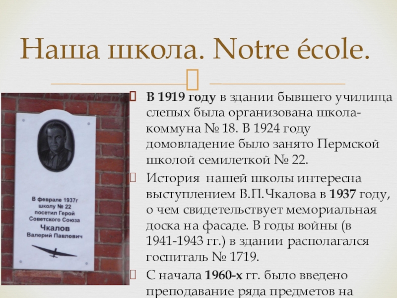История нашей школы интересна выступлением В.П.Чкалова в 1937 году, о чем свидетельствует мемориальная доска на фасаде. В годы войны (в 1941-1943 гг.) в здании располагался госпиталь № 1719.